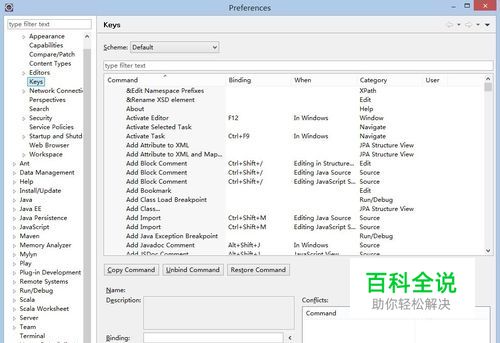 点击window菜单->preferences子菜单->general->keys,进入快捷键管理界面