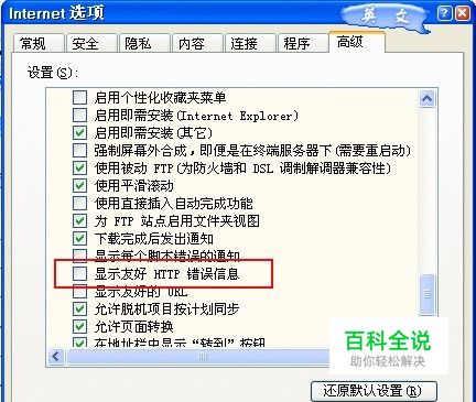 方法为:请打开浏览器,选择工具,internet选项,高级,在高级中的浏览项目里面有一个"显示http友好错误提示"的复选框,请取消该复选框,这样您可以获得正确的错误提示。 在获得正确的错误提示之后,您就可以根据该错误提示检查您具体的出错原因了。根据出错的具体原因,再进行相应调试即可解决。