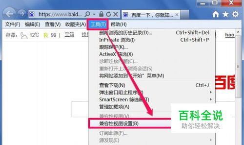 设置兼容先打开IE浏览器,点击“工具”菜单,如果在窗口上边,没有菜单栏,就在上面标题栏上右键,选择“菜单栏”,就会出现工具菜单了。