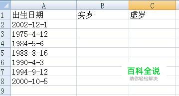 虚岁C2单元格中输入公式:=(today(),"y")/365 today()为当前日期。 ”y“为返回后年数。 回车后虚岁年龄就显示出了,