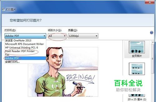 接下来在打印对话框中的打印机下拉框中选择Adobe PDF或者Foxit Reader PDF Printer等虚拟打印机,纸张大小选A4(以自己所需的大小而定),每个图片都先这样生成统一纸张的PDF文件