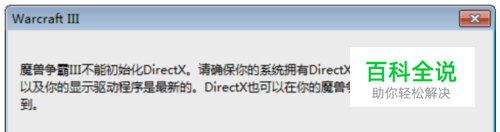 首先,启动War3时显示“魔兽争霸三不能初始化DirectX。请确保不得系统拥有DirectX8.1或者更高的版本以及你的显示驱动程序是最新的。DirectX也可以在你的魔兽争霸三安装盘上找到。”