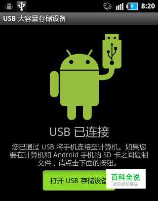 将手机通过USB数据线与电脑连接,然后打开手机中的“USB存储”开关,从而进入手机U盘模式。