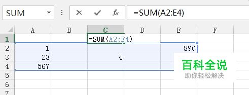 第四种:对区域求和 最后再来试试这种方法计算1,23,4,567,890的和。 任意单元格中输入:1,23,4,567,890这些数字,然后对这些单元格所在区域求和。 例如:在A2,E4这一块区域中分别输入上述数字,中间可以空白,系统会把它们当0看,然后在这一区域外的任意空白单元格内输入 =sum(A2:E4) 回车 此时,表示计算左上角为A2右下角为E4的这个区域中所有单元格中的值的和并显示到该单元格中。(见下图) 参数为连续区域的时候,可以先把鼠标放到括号中,直接选其他单元格,因为是连续的,所以直接选上左上角鼠标不松开,拖动到右下角最后一个就可以了。 当然可以选中第一个单元格以后,按住Shift,再选最后一个单元格,这样整个区域就被选中了。