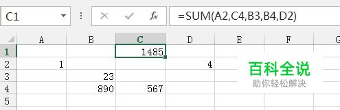 第二种:对几个单元格求和 用这种方法计算1,23,4,567,890这些数字的和。 任意不同单元格中输入:1,23,4,567,890这些数字,然后对这些单元格求和。 例如:在A2,C4,B3,B4,D2中分别输入上述数字,然后在任意空白单元格内输入 =sum(A2,C4,B3,B4,D2) 回车 此时,表示计算A2,C4,B3,B4,D2这几个单元格中的值的和并显示到该单元格中。(见下图) 参数为单元格的时候,可以先把鼠标放到括号中,直接选其他单元格,这样就不用去找单元格地址了一个一个往里写了。 按住Ctrl一个一个的选可以选多个不连续的单元格。