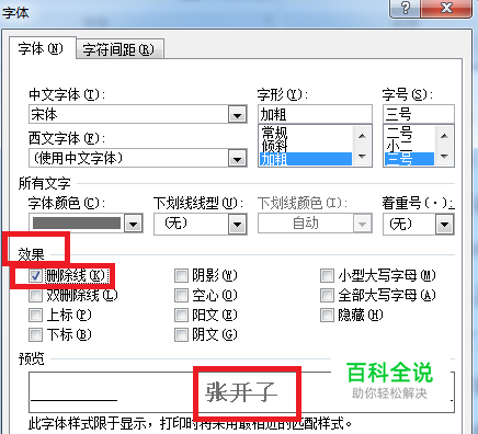 这时在弹出的字体菜单里,在下方找到接下来在 删除线前打对号,这时我们可以看到“张开了”这三个字的效果,点击