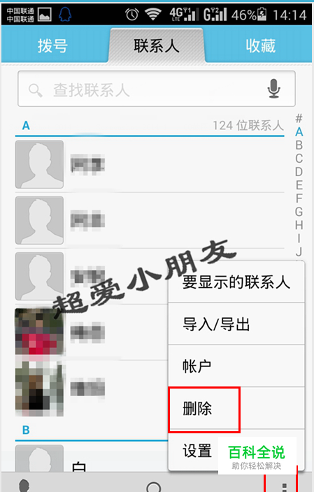 先说比较常规的方法。 很多手机的联系人程序自带删除功能。以华为EMUI2.3为例,打开联系人,可以看到右下角有三个点,这个相当于其他手机的“设置”