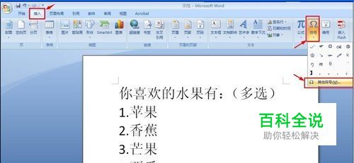 将光标放在word文档的“任意”位置,切换到“插入”标签,找到“符号”下拉列表的“其他符号”。
