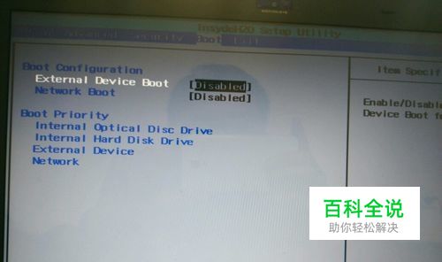用键盘左右键将光标移到Boot位置,将光标放在External Device Boot