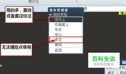 弹出对话框,用的最多而且实用价值高的就是图元和求交。图元可以说可以标注80~90%的尺寸,如果无法确认交点,可以用求交确认位置。