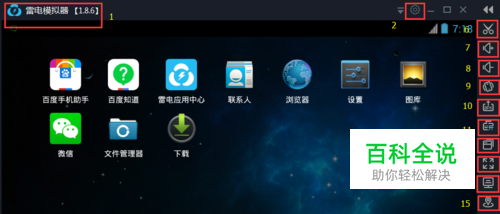 1、雷电模拟器标题(可在多开器中随意修改);2、雷电模拟器设置按钮;3、雷电模拟器返回按键(快捷键盘ESC);4、雷电模拟器主页键(快捷键盘Home);5、雷电模拟器菜单键(快捷键PageUp);其中返回键、主页键、菜单键快捷键查看可在系统设置-属性设置中查看6、截取屏幕(快捷键ctrl+0)7、放大音量(快捷键ctrl++)8、减少音量(快捷键ctrl+-)9、摇一摇 (快捷键ctrl+6)10、添加Apk文件(快捷键ctrl+3)11、键盘操控按钮12、多开器 (快捷键ctrl+2)13、共享文件(快捷键ctrl+5)14、虚拟定位(快捷键ctrl+7)15、操作录制(快捷键ctrl+8)