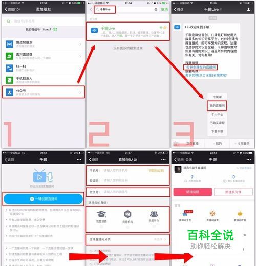 ①打开手机微信,查找公众号 ②找到微信公众号“千聊live”并关注 ③进入公众号,点击「我的」→「我的直播间」或「1分钟创建我的直播间」 ④点击「一键创建直播间」 ⑤输入正确的手机、微信资料,选好身份和分类,点击「确定」 ⑥如图,直播间创建成功