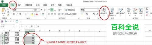 步骤2、点击最上方菜单栏上的“开始”菜单,然后鼠标选中需要应用条件格式的单元格区域,如小编示例文件,选中C2:C5成绩列这块区域;