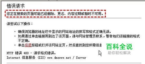 1-首先,错误分析,错误请求,400错误提示:您正在搜索的页面可能已经删除、更名、内容过期或暂时不可用。综合其它用户经常向我们反馈的原因,来一一排除解决它;