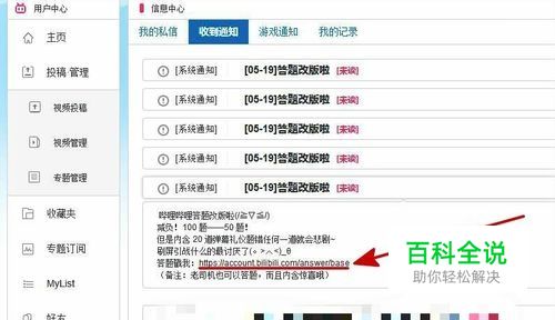 第二种是请先登录你的B站帐号,之后在你的“用户中心”的“信息中心”里的“收到通知”中,会有来自官方网站的题为“答题改版啦”的通知。此时,请打开它,然后复制登录其中的网址即可。