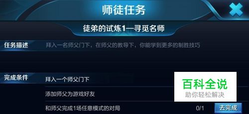 徒弟任务1:寻觅名师 1.拜入一个师父门下 2.添加师父为游戏好友 3.和师父完成1场任意模式的对局。