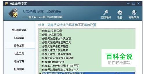 选择U盘专杀中的“修复系统”,可以选择“清除病毒快捷方式及恢复隐藏文件夹”,如果U盘有其他问题,也可以选择“全选”,单击“开始修复”即可。
