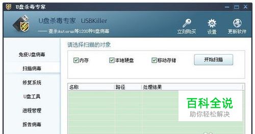 这时可以打开U盘专杀工具,选择需要扫描的对象,然后点击“开始扫描”。扫描完毕,U盘杀毒专家就会对文件夹快捷方式病毒进行查杀并显示该病毒及处理结果。