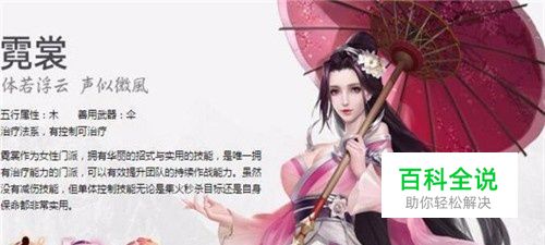 霓裳五行属性:木 战斗偏好:法术偏治疗 使用武器:伞