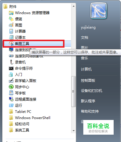 在“开始”-“所有程序”-“附件”中点击“屏幕截图”,或者使用“SnippingTool”命令打开WIN7系统自带屏幕截图工具。
