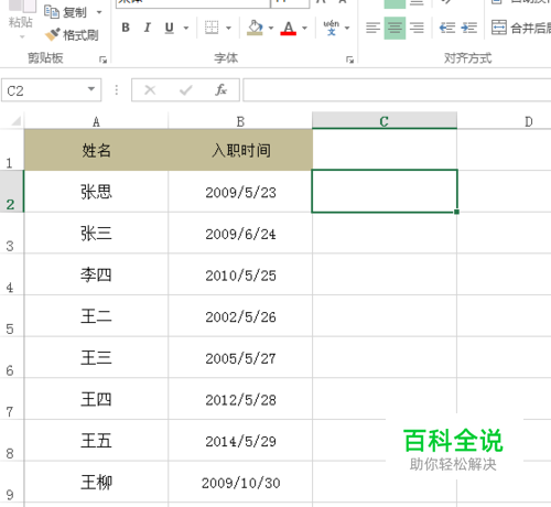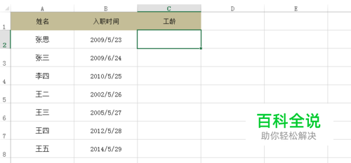 在工龄列C2输入公式:=YEAR(TODAY())-YEAR(B2),Enter键即可返回对应的工龄。year函数为只取年份,today函数为现在的日期。