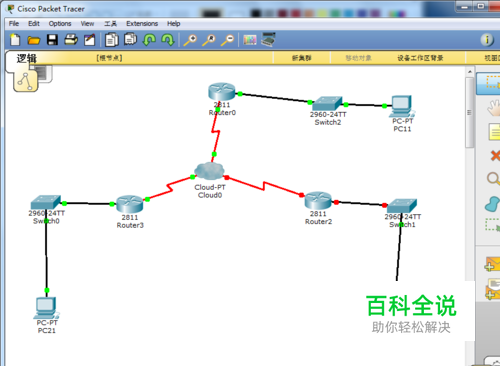 1. 首先打开思科模拟器软件,找出3台2811类的路由器,和3台2960类型的交换机,电脑3台,帧中继交换机一台,若干条双绞线,将它们连接起来,如下图所示: