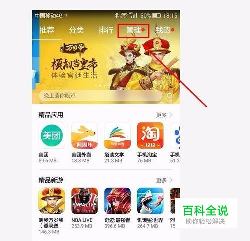 首先,登录手机,找见华为应用市场,如图所示,点击‘管理’