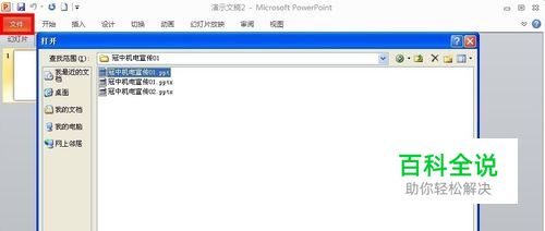 打开office2010。 点开左上角“文件”—“打开”—找到你要打开的ppt文件。