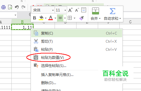 再次右击这个单元格选择“粘贴为数值”,如果没有这一项,则在“选择性粘贴”中寻找。