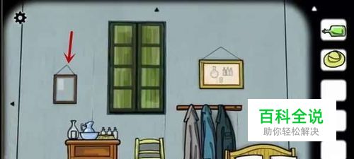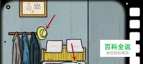 先到床上看看,拿走衣架上的帽子、枕头下面的碎片,点击中间的衣服,会落下钥匙。