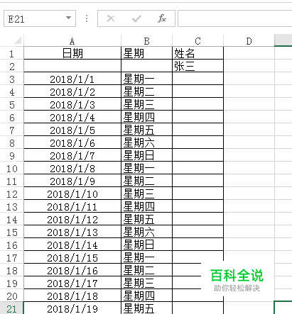 如图1,打开excel表格在A列写上日期,B列写上星期,C列写上姓名