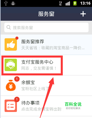 打开手机支付宝程序,在程序主界面中切换到“服务窗”选项卡,点击“支付宝服务中心”项进入。