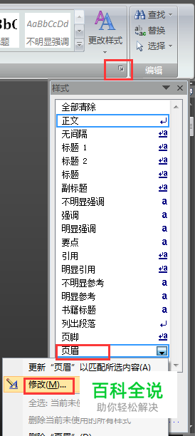 选择“开始”选项,单击“样式”按钮,再其下拉列表中找到“页眉”,点击页眉选项后倒三角符号打开下拉列表,选择“修改”命令。 ps:可通过快捷键ctrl+alt+shift+s快速打开样式下拉列表。