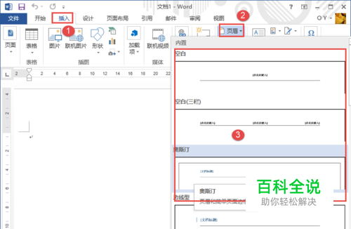 首选我们把插入一个页眉页脚。点击插入,点击页眉,点击选择一个样式。