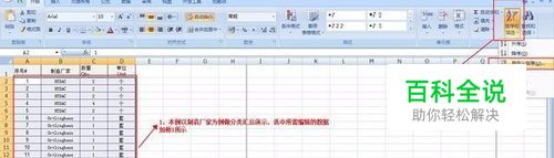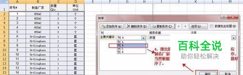 弹出排序对话框,选择主要关键字为列B(对应制造厂家数据),排列依据选择数值,次序默认升序,也可根据具体使用要求选择降序,点击确定,数据就自动排序好了(标记4)