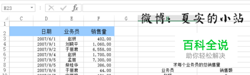 同理我们也建立销售量的名称,引用销售量的范围,然后我们就使用sumif函数进行计算,格式是“=sumif(业务员,H10,销售量)”回车就可以看到相对应的结果了。之后就填充下拉即可