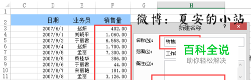 在名称管理器的左上方有一个新建的按钮,我们点击新建。然后建立业务员员的名称,关于引用的位置我们就选择所有的业务员那一栏,注意是绝对引用。