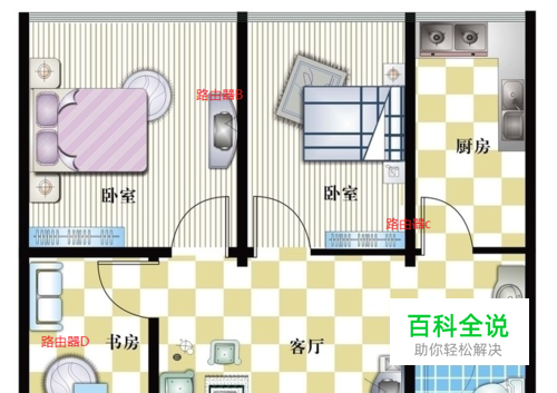 首先根据空间位置和电脑的摆放位置,画一张简单的路由器摆放位置。如图 这里需要注意的是,请根据实际空间平方,结合无线路由器的功率覆盖面积,来规划路由器位置。 如同一个位置一个路由器不够用,可以摆放2个或是更多路由器。