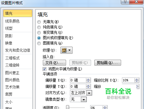 选择--图片与纹理填充。勾选--将图片平铺为纹理,就可以使用纹理填充。
