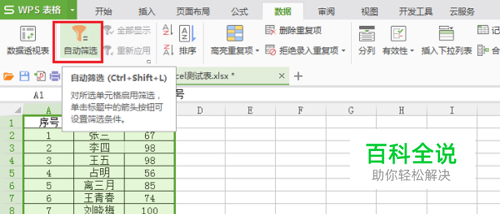 第二步点击数据之后,选择上要筛选的数据,点击自动筛选,如下图所示: