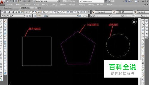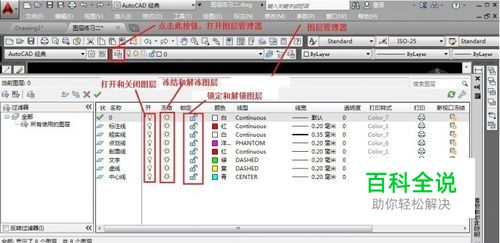 打开图层管理器,设置粗实线图层为“关闭”状态;点划线图层设置为“冻结” 状态;虚线图层设置为“锁定”状态