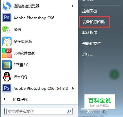 首先打开电脑,点击左下角开始,选择设备和打印机。