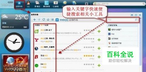 组装篇:1500多款实用小工具供自选 目前集合了1500多款应用的WebQQ应用市场2.0,如同百宝箱供亿万网友自由拼装自己想要的功能,同时新增的WebQQ 2.0版应用搜索和重点应用推荐,让使用体验更顺畅。 登录WebQQ后,点击左上角的应用市场图标,在弹出的对话框里,根据自身需要添加各类应用;如果快捷菜单里没有需要的应用,在工具搜索栏中输入要查找相关工具或关键字,之后便可搜索到相关工具选项。如输入"办公"关键词点击搜索,便能快速搜索到相关工具。(图1)