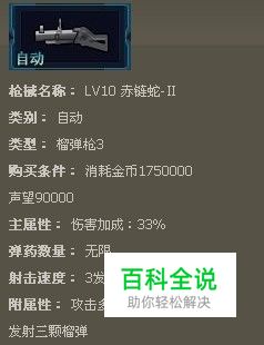 枪魂赤链蛇-II枪械属性介绍 榴弹枪系列 枪械名称: LV10 赤链蛇-Ⅱ 类别: 自动 类型: 榴弹枪3 购买条件: 消耗金币1750000 声望90000 主属性: 伤害加成:33% 弹药数量: 无限 射击速度: 3发/秒 附属性: 攻击多个敌人 发射三颗榴弹