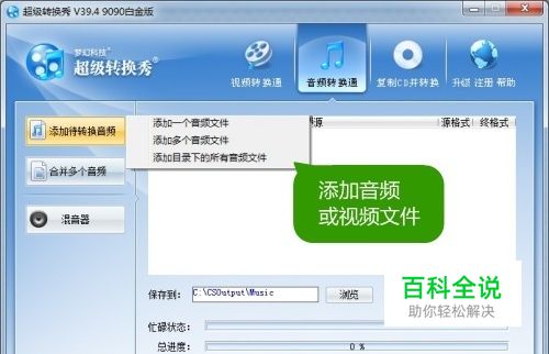 将在网上下载的音乐或视频文件导入超级转换秀 如下图,先切换到“音频转换通”选项卡,再点击左上角的“添加待转换音频”,即可添加自己下载到的音乐。同时,这款软件也兼具将视频转换成音频的功能,所以,也可在这里添加视频文件,以将视频中的美妙音乐转换出来放到ipad3上欣赏。