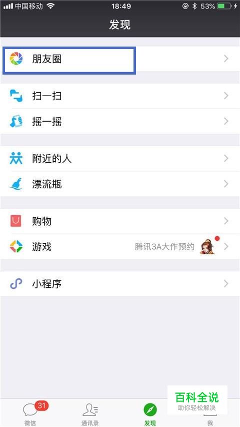 首先点击微信中的朋友圈,如下图所示。