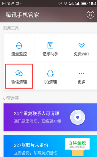 打开腾讯手机管家,点击实用工具中的微信清理功能。对微信里面的信息进行扫描。