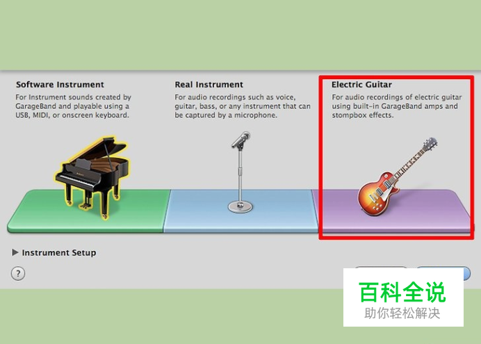决定是用“软件乐器”、“真实乐器”还是“电吉他”。 软件乐器中可以用GarageBand内置的乐器,通过电脑键盘,或通过以MIDI或USB方式连接的键盘,进行奏乐并录音。 如果选了真实乐器,就可以用电脑录音机进行录音(乐器或语音)。 电吉他中可以调整GarageBand内置的扩音器、延时器等效果进行奏乐、录音。
