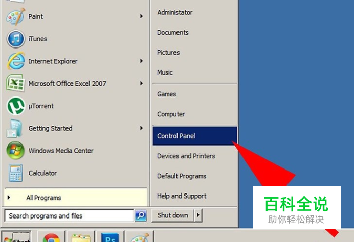 找到开始菜单并且点击“控制面板”。