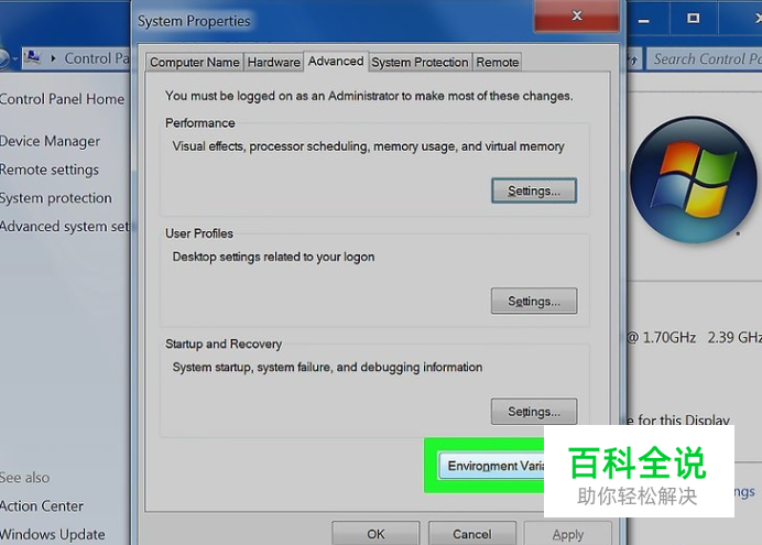 点击系统属性窗口中的环境变量按钮。它位于窗口的底端。